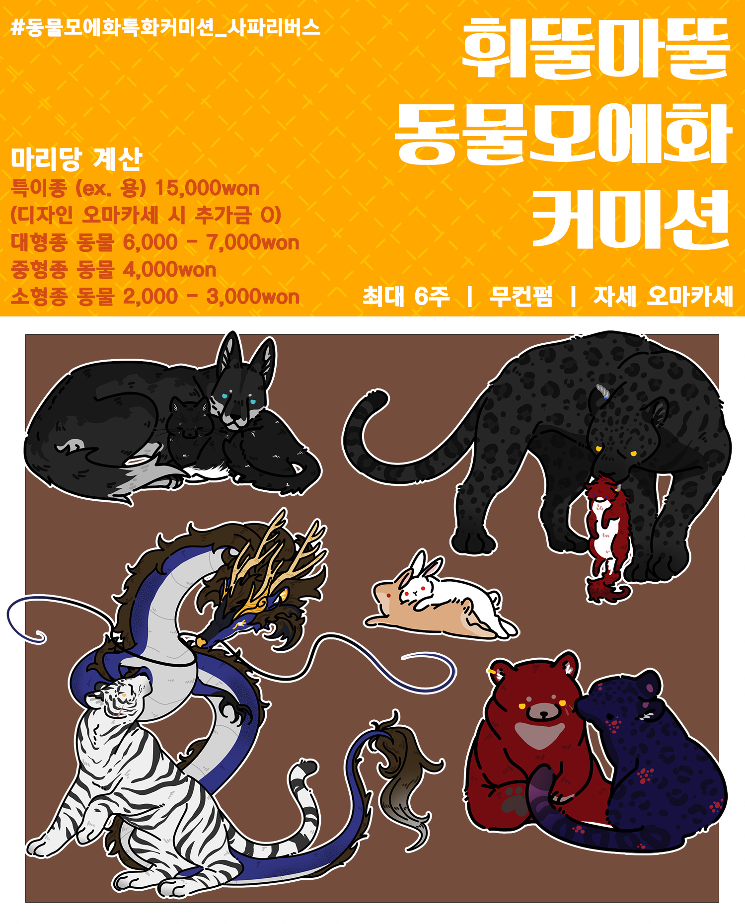 - 동물은 마리 당으로 금액이 책정되며, 드래곤 / 용 등의 특이종 작업이 가능하오나 디자인 오마카세 시 5,000원의 추가금이 발생합니다.
